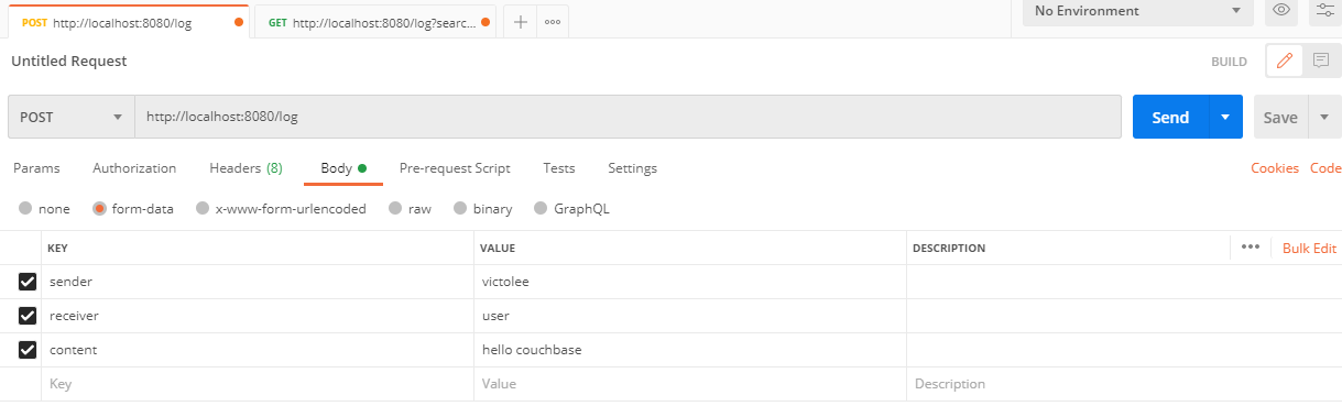 메시지는 Couchbase 어드민의 Documents 탭에서 확인할 수 있습니다.