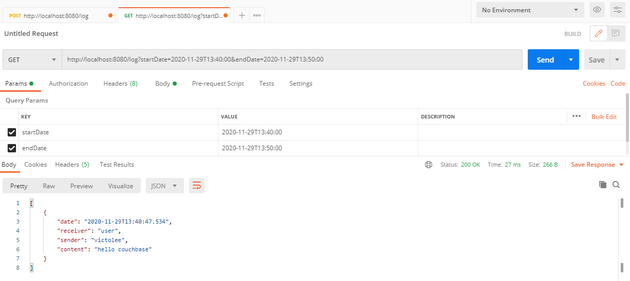 - 파라미터인 두 일시 사이에 존재하는 로그 리스트를 조회하는 API