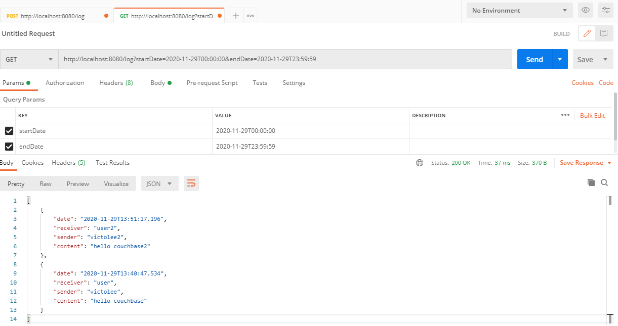 List<MessageLogDto> messageLogDtos = messageLogService.getLogList(LocalDateTime.parse(startDate), LocalDateTime.parse(endDate));
