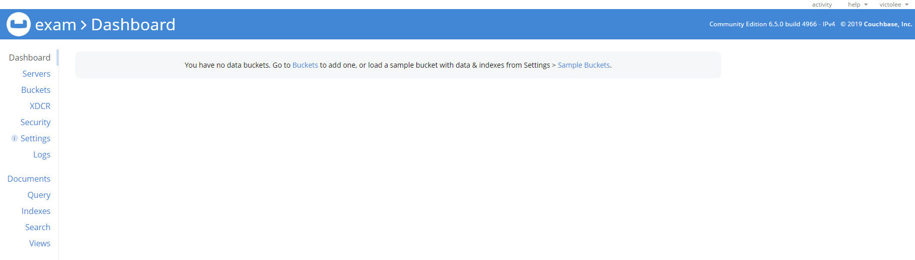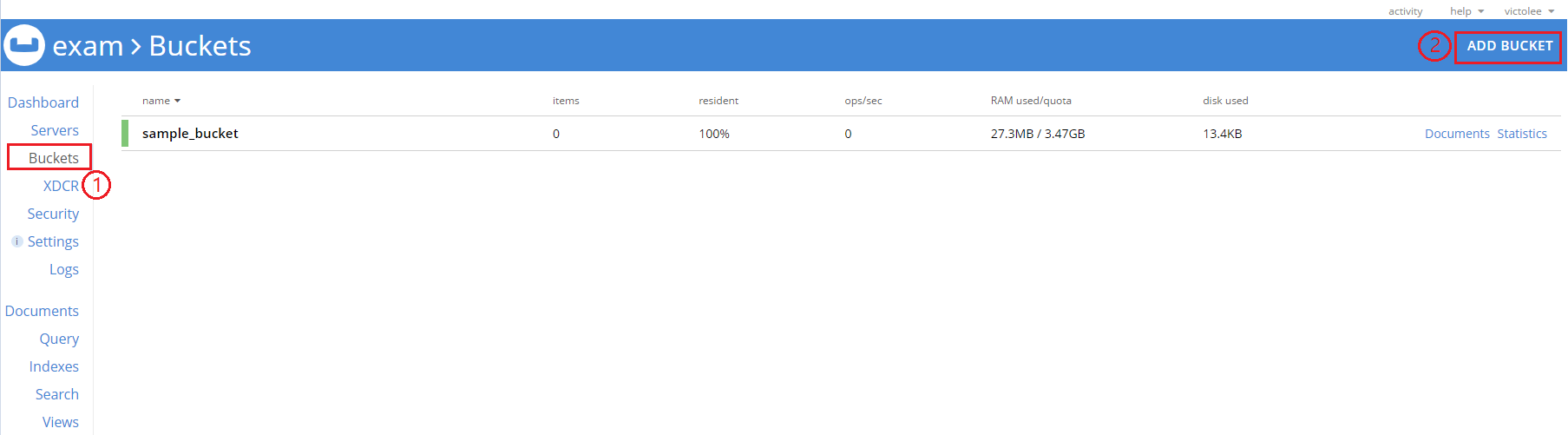 우선 테스트하기에 앞서, Couchbase dashboard의 Buckets탭에서 버킷을 생성합니다.