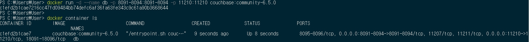 # docker run -d --name db -p 8091-8094:8091-8094 -p 11210:11210 couchbase:community-6.5.0